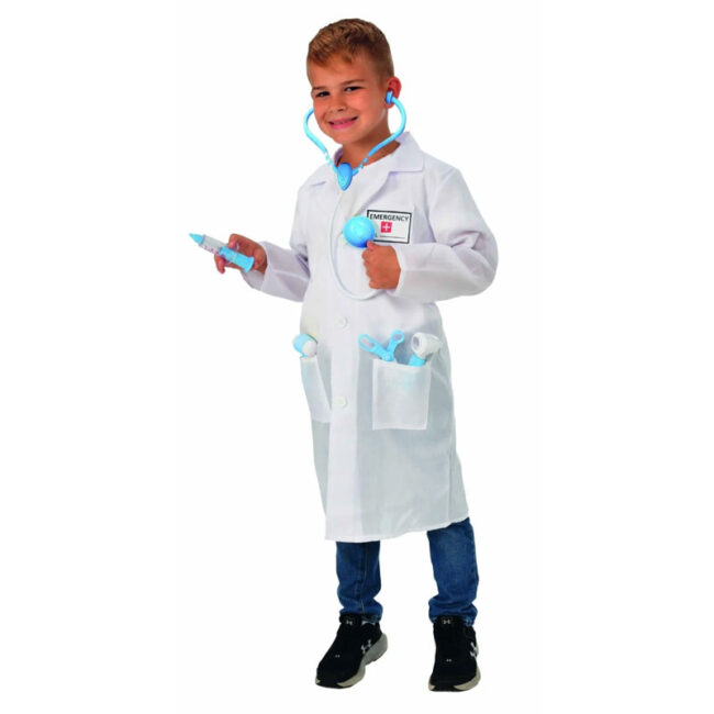 Déguisement Role Play Docteur 5/8 Ans Il contient une blouse, un stéthoscope, un marteau pour tester les réflexes, un otoscope, une seringue et une paire de ciseaux. Dès 5 ans.