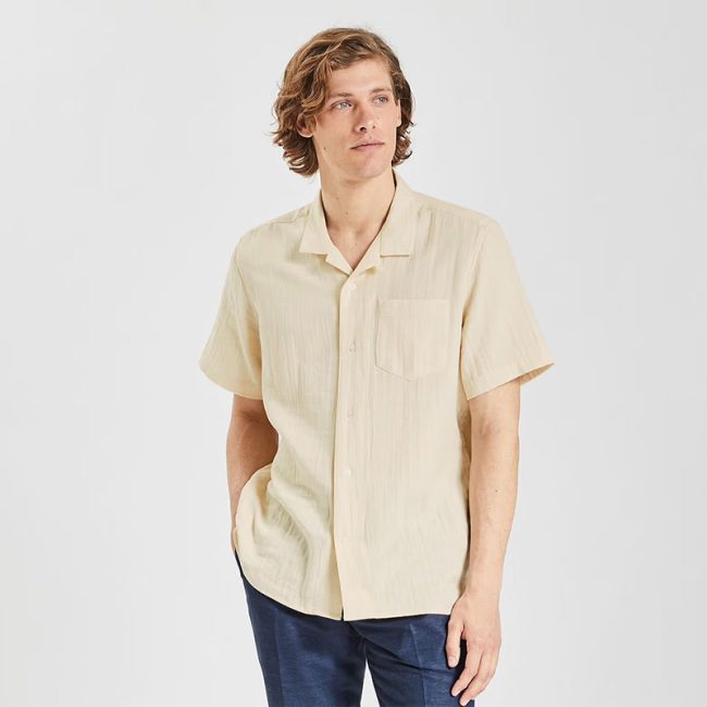 Cette chemise hawaïenne unie en gaze de coton, nouvelle matière tendance, est souple et agréable à porter. Elle apportera une touche de légèreté à votre tenue ! Coupe regular, ni trop ajustée ni trop large avec un tombé droit Col hawaïen Fermeture boutonnée Poche plaquée poitrine Manches courtes